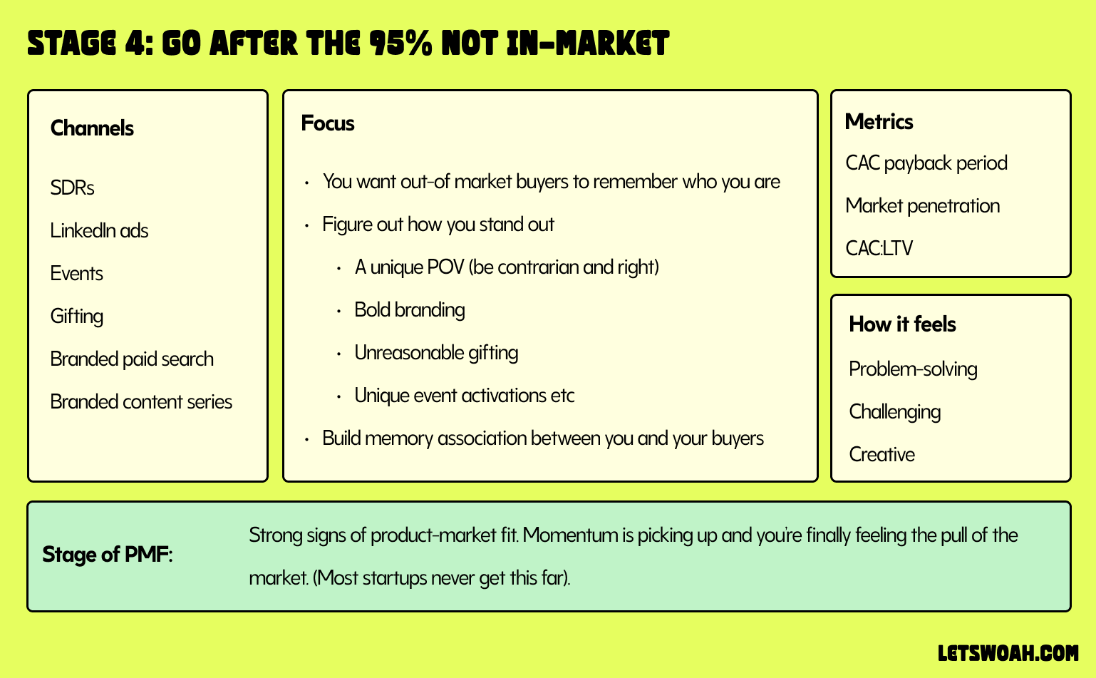 You’ve reached the fourth stage. Great job—many startups won’t make it this far. Or they’ll try these channels but really, they’ll be stuck in previous stages with low levels of PMF. It’s costly to skip to this stage without strong product–market fit—not only will it be expensive, but you’ll waste energy on the wrong channels which will cost you results.