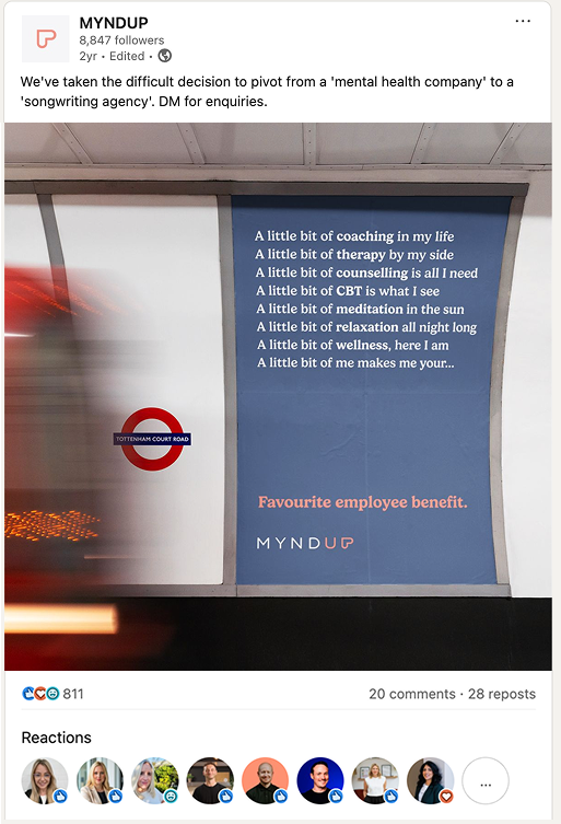 I used CEPs to great effect when I led the marketing team at a B2B mental health startup called MYNDUP. We realised that a common CEP for our ICP was when HR teams became frustrated with the mental health provisions their Employee Assistance Programmes (EAPs) offered their employees. EAPs do a great job for the cost, but they’re very limited. For HR teams who want to do more for their employees, MYNDUP is a great alternative. And so we ran a few ad variants testing this CEP as a LinkedIn ad. The ad below was our most successful. It was highly shared by HR teams across ‘dark social’ channels like Slack, Microsoft Teams, WhatsApp, and online communities. Through asking leads ‘How did you hear about us?’ on our demo form and on sales calls, we learnt that this single ad creative generated close to 30% of the leads we generated in 2023.
